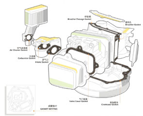 1、空氣濾清器(Air cleaner gasket) 2、化油器(Carburetor gasket) 3、進氣口(Intake gasket) 4、氣門室蓋(Valve cover gasket) 5、通風(fēng)孔(Breather gasket) 6、呼吸槽(Breather passage gasket) 7、曲軸箱體(Crankcase gasket) |